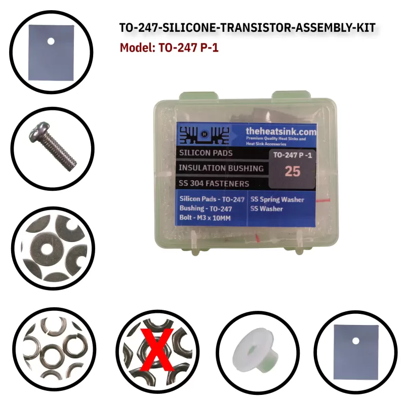 The kit can be used to mount electronic components with TO-247 cases to be mounted on to the heat sink with proper electrical isolation and good thermal conductivity. The kit can be used with or without thermal grease / heatsink compound.